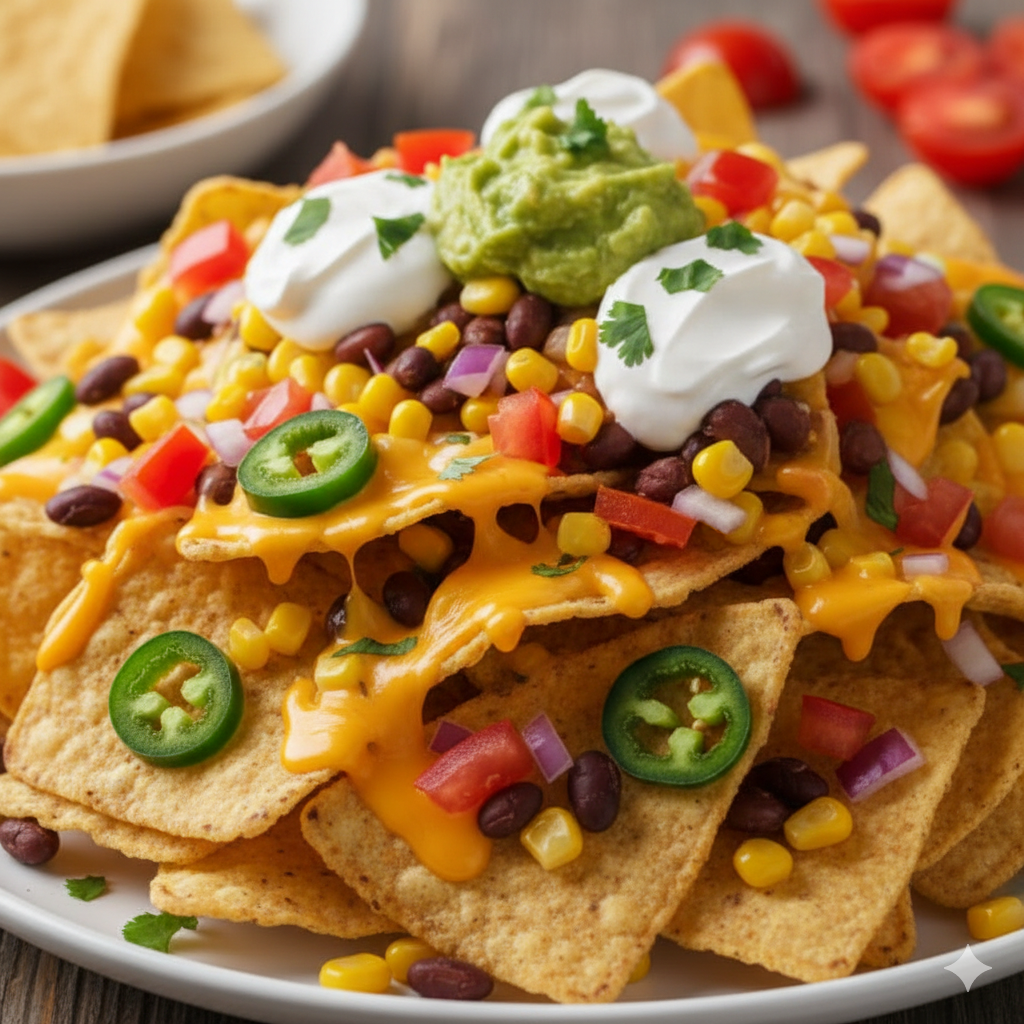 Crunchy corn tortilla chips are piled high with melted cheddar cheese, hearty black beans, and sweet corn. Topped with fresh pico de gallo, creamy guacamole, cool sour cream, and spicy jalapeños, they offer the perfect balance of heat and zest.